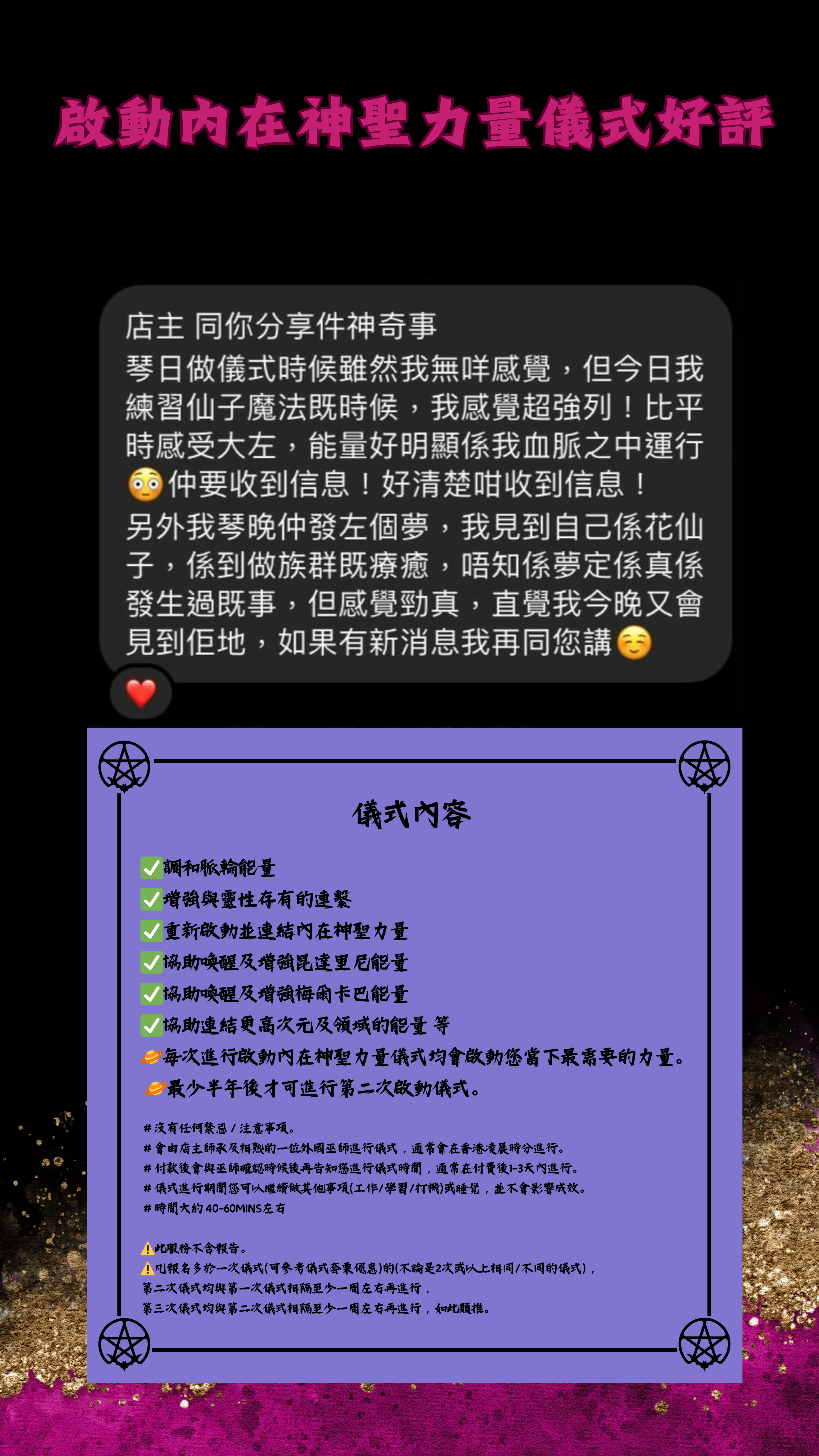 🌊請查閱每月可預約時間,與店主確認時間。 🔺請在備註填寫 中文/英文全名 + 生日年月日 (e.g Chan Da Ming, 01-01-2000) 🔸請在備註填寫聯絡店主時所用的 軟件+電話/名稱 (e.g 𝒔𝒊𝒈𝒏𝒂𝒍 9731 4644 / 𝑰𝑮 𝒛𝒓𝒂._.𝒉𝒆𝒂𝒍𝒊𝒏𝒈 等) 🔹收件地址可填寫 -- / NV - 儀式內容 : ✅調和脈輪能量 ✅增強與靈性存有的連繫 ✅重新啟動並連結內在神聖力量 ✅協助喚醒及增強昆達里尼能量 ✅協助喚醒及增強梅爾卡巴能量 ✅協助連結更高次元及領域的能量 等 🪐每次進行啟動內在神聖力量儀式均會啟動您當下最需要的力量。 🪐最少半年後才可進行第二次啟動儀式。 - #沒有任何禁忌/注意事項。 #會由店主師承及相熟的一位外國巫師進行儀式,通常會在香港凌晨時分進行。 #付款後會與巫師確認時候後再告知您進行儀式時聞,通常在付費後𝟭-𝟯天內進行。 #儀式進行期開您可以繼續做其他事項(工作/學習/打機)或睡覺,並不會影響成效。 #時間大約 𝟰𝟬-𝟲𝟬𝗠𝗜𝗡𝗦左右 ⚠️此服務不含報告。 ⚠️凡報名多於一次儀式(可參考儀式套票優惠)的(不論是𝟮次或以上相同/不同的儀式),第二次儀式均與第一次儀式相隔至少一周左有再進行,第三次儀式均與第二次儀式相隔至少一周左右再進行,如此類推。 - 儀式需要資料 : 中文/英文法定全名+生日年月日 (如果是併音請提供中文全名) 🌟任何因客人給予不實資料,而導致儀式有任何錯誤/問題,本店概不負責。本店也會將該客人列入黑名單,任何帳戶,不為該客人提供任何服務。 - 👤適合對象 : 任何人 💰能量交換價 : 𝗛𝗞𝟭𝟴𝟴𝟴