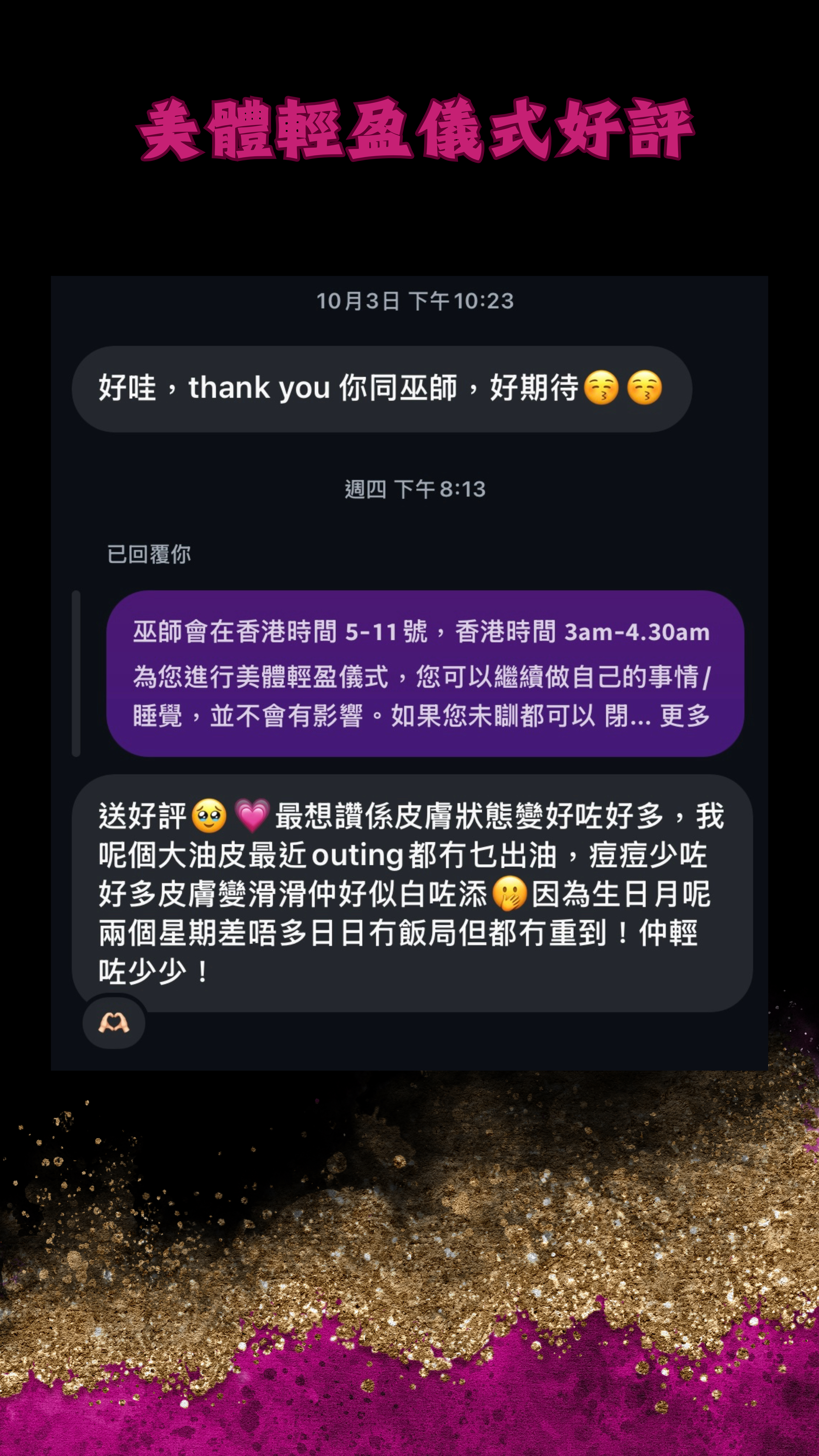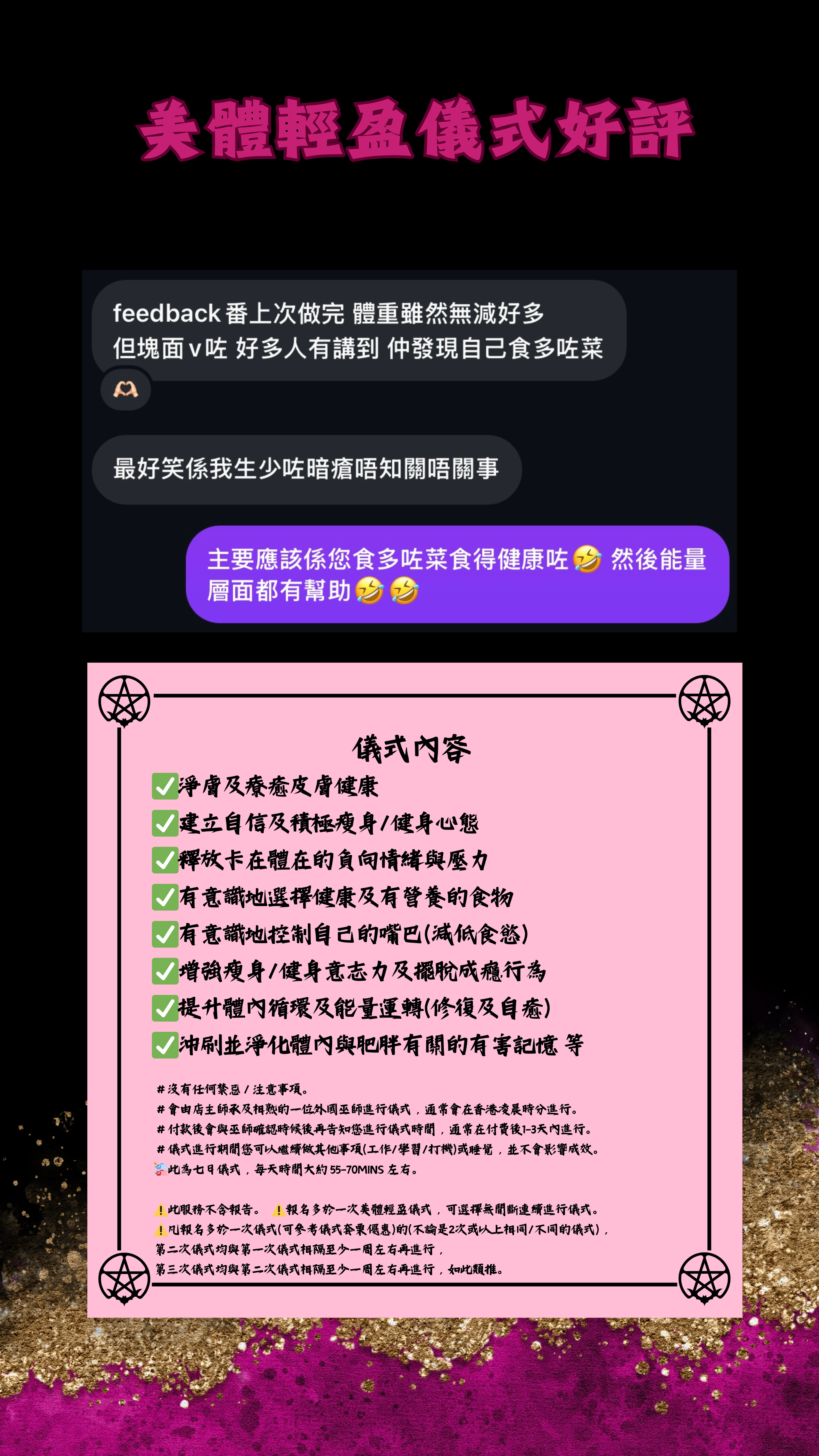🌊請查閱每月可預約時間,與店主確認時間。 🔺請在備註填寫 中文/英文全名 + 生日年月日 (e.g Chan Da Ming, 01-01-2000) 🔸請在備註填寫聯絡店主時所用的 軟件+電話/名稱 (e.g 𝒔𝒊𝒈𝒏𝒂𝒍 9731 4644 / 𝑰𝑮 𝒛𝒓𝒂._.𝒉𝒆𝒂𝒍𝒊𝒏𝒈 等) 🔹收件地址可填寫 -- / NV - 儀式內容 : ✅淨膚及療癒皮膚健康 ✅建立自信及積極瘦身/健身心態 ✅釋放卡在體在的負向情緒與壓力 ✅有意識地選擇健康及有營養的食物 ✅有意識地控制自己的嘴巴(減低食慾) ✅增強瘦身/健身意志力及擺脫成癮行為 ✅提升體內循環及能量運轉(修復及自癒) ✅沖刷並淨化體內與肥胖有關的有害記憶 等等 - #沒有任何禁忌/注意事項。 #會由店主師承及相熟的一位外國巫師進行儀式,通常會在香港凌晨時分進行。 #付款後會與巫師確認時候後再告知您進行儀式時聞,通常在付費後𝟭-𝟯天內進行。 #儀式進行期開您可以繼續做其他事項(工作/學習/打機)或睡覺,並不會影響成效。 🎏七日儀式,每天時間大約 𝟱𝟱-𝟳𝟬𝗺𝗶𝗻𝘀 左右 ⚠️此服務不含報告。 ⚠️凡報名多於一次儀式(可參考儀式套票優惠)的(不論是𝟮次或以上相同/不同的儀式),第二次儀式均與第一次儀式相隔至少一周左有再進行,第三次儀式均與第二次儀式相隔至少一周左右再進行,如此類推。 ⚠️⚠️⚠️此儀式巫師每星期只會接三位個案,可先詢問預期進行時間再選擇服務。⚠️⚠️⚠️ - 儀式需要資料 : 英文法定全名+生日年月日 (如果是併音請提供中文全名) 🌟任何因客人給予不實資料,而導致配對有任何錯誤/問題,本店概不負責。本店也會將該客人列入黑名單,任何帳戶,不為該客人提供任何服務。 - 👤適合對象 : 任何人 💰能量交換價 : 𝗛𝗞𝟭𝟱𝟱𝟱