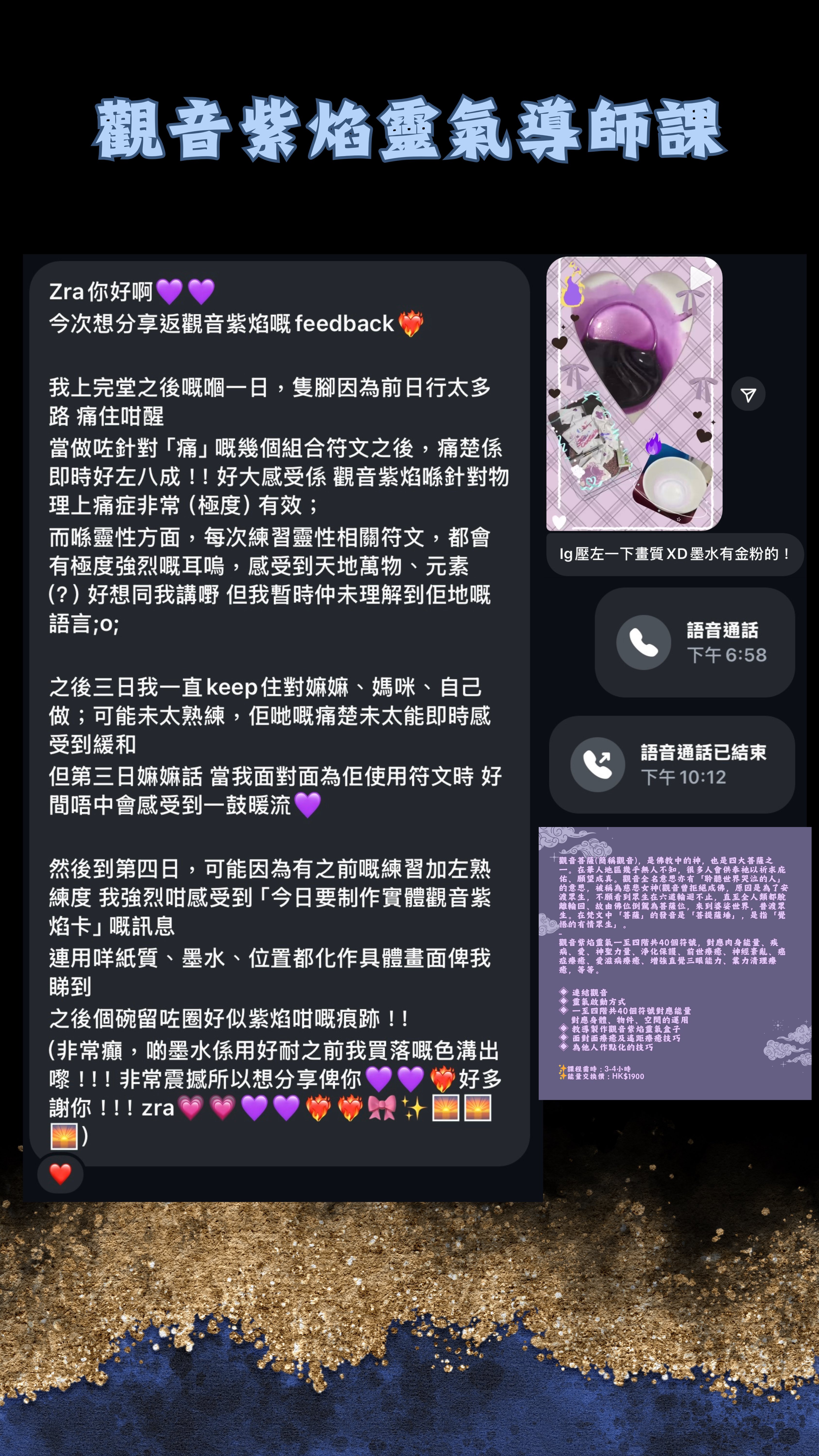 🌊請查閱每月可預約時間,與店主確認時間。 🔺請在備註填寫 中文/英文全名 + 生日年月日 (e.g Chan Da Ming, 01-01-2000) 🔸請在備註填寫聯絡店主時所用的 軟件+電話/名稱 (e.g 𝒔𝒊𝒈𝒏𝒂𝒍 9731 4644 / 𝑰𝑮 𝒛𝒓𝒂._.𝒉𝒆𝒂𝒍𝒊𝒏𝒈 等) 🔹收件地址可填寫 -- / NV - 觀音菩薩(簡稱觀音),是佛教中的神,也是四大菩薩之一。在華人地區幾乎無人不知,很多人會供奉衪以祈求庇佑、願望成真。觀音全名意思亦有「聆聽世界哭泣的人」的意思,被稱為慈悲女神(觀音曾拒絕成佛,原因是為了安渡眾生,不願看到眾生在六道輪迴不止,直至全人類都脫離輪回、故由佛位倒駕為菩薩位,來到婆娑世界,普渡眾生。在梵文中「菩薩」的發音是「菩提薩埵」,是指「覺悟的有情眾生」。 - 觀音紫焰靈氣一至四階共40個符號,對應肉身能量、疾病、愛、神聖力量、淨化保護、前世療癒、神經紊亂、癌症療癒、愛滋病療癒、增強直覺三眼能力、業力清理療癒,等等。 - 🌈課堂內容 : ◈ 連結觀音 ◈ 靈氣啟動方式 ◈ 一至四階共𝟰𝟬個符號對應能量 *對應身體、物件、空間的運用 ◈ 教導製作觀音紫焰靈氣盒子 ◈ 面對面療癒及遙距療癒技巧 ◈ 為他人作點化的技巧 ✨課程需時 : 𝟯-𝟰小時 ✨能量交換價 : 𝗛𝗞$𝟭𝟵𝟬𝟬 - 🌈歡迎前往 #zra_靈性課程 了解更多課程/工作坊。 🌈可到精選動態中查看每月課程時間表。 ❗️所有課程均以粵語授課 (普通話可私人約課) ❗️請於報名後3天內繳交費用,以確認留位,名額先到先得。 ❗️因個人原因未能出席工作坊,將不設退款或轉時間。若病假請出示病假紙 ❗️所有工作坊/課程詳情前住Pofile「工作坊介紹」「課程介紹」的精選動態中瀏覽。 ❗️所有時間、上課地點最終調動權歸本店所有。 🌟2人起可自組時間上課,可𝐎𝐧𝐥𝐢𝐧𝐞上課🌟 🌟1對1授課只限𝐎𝐧𝐥𝐢𝐧𝐞,附加課程費用𝟏𝟎%(海外客人無需附加費)🌟 🌟可私詢店主約時間,尋找相同興趣的人組堂🌟