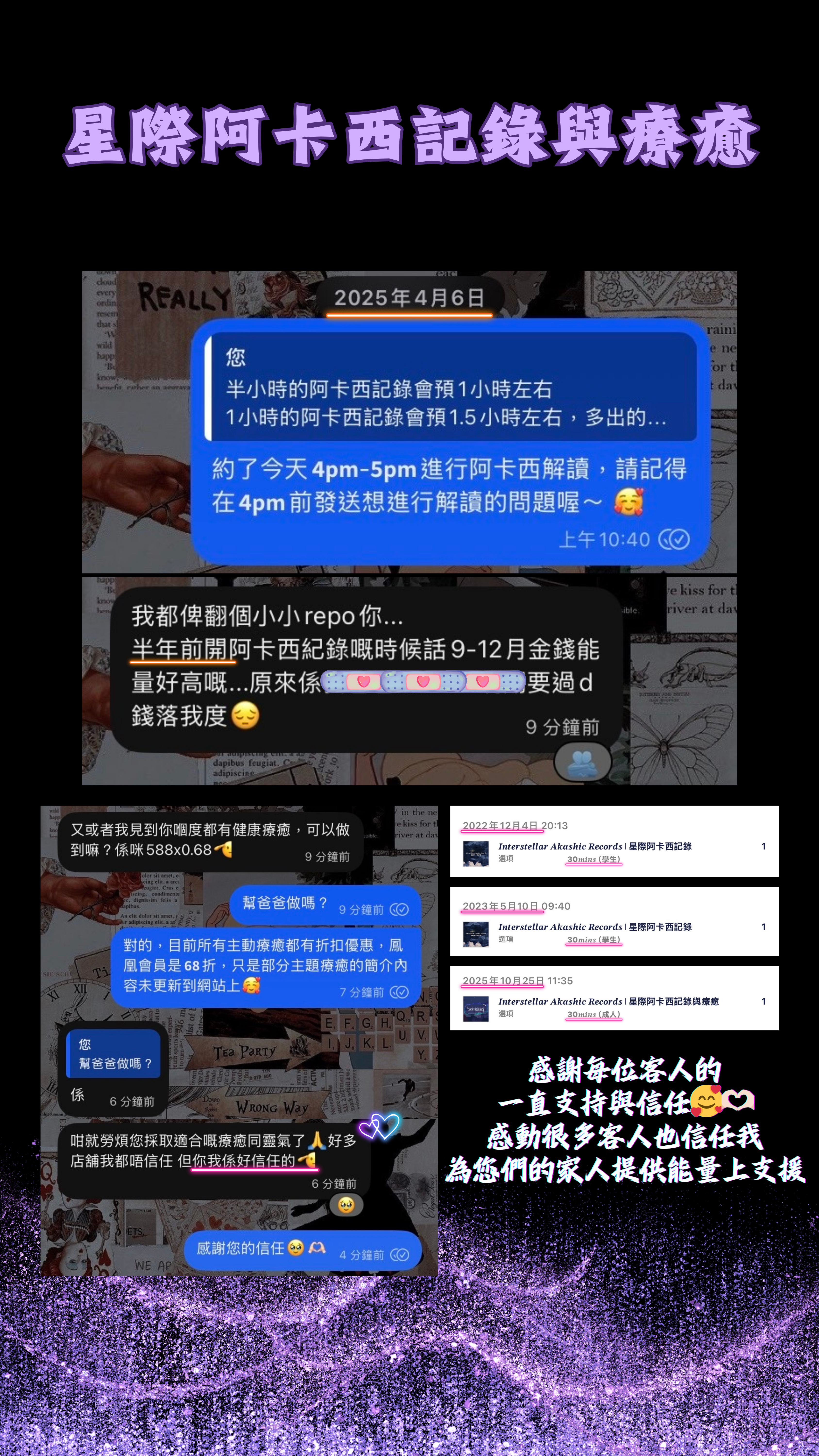 ๐่ซๆฅ้ฑๆฏๆๅฏ้ ็ดๆ้๏ผ่ๅบไธป็ขบ่ชๆ้ใ ๐บ่ซๅจๅ่จปๅกซๅฏซ ไธญๆ/่ฑๆๅ จๅ + ็ๆฅๅนดๆๆฅ (e.g Chan Da Ming, 01-01-2000) ๐ธ่ซๅจๅ่จปๅกซๅฏซ่ฏ็ตกๅบไธปๆๆ็จ็ ่ปไปถ+้ป่ฉฑ/ๅ็จฑ (e.g ๐๐๐๐๐๐ 9731 4644 / ๐ฐ๐ฎ ๐๐๐._.๐๐๐๐๐๐๐ ็ญ) ๐นๆถไปถๅฐๅๅฏๅกซๅฏซ -- / NV - ๐ช๐ฐ๐๐๐๐๐๐๐๐๐๐๐ ๐จ๐๐๐๐๐๐ ๐น๐๐๐๐๐ ๐ โ ๆ้้ฟๅก่ฅฟ่จ้่็็๐ช ้ฟๅก่ฅฟๆฏไธๅๅ ดๅฐ้ ๅ๏ผๅจ้ไนไธญๆไธๅ็้จๅ๏ผๆ็ฎก็ๆจ็ๅไบบ่จๆฏ๏ผ็ถไธญ็ๅๆธๅบซ้จไฝๆฏไธๅๅฒๅญไบๆดๅๅฎๅฎๆ็ผ็้็ไธๅไบบใไบใ็ฉ่จๆฏ็ญ็ญ๏ผๅฎๅฎ๏ผ้ๆฒณ็ณป๏ผๅคช้ฝ็ณป๏ผๅฐ็๏ผๅ ถไปๆๆ็ๆญทๅฒใ็ฅ่ญใ็งๆใ่ชๅทฑ็้ๅปๅๆชไพใ่่ชๅทฑ็ธ้ไบบ็้ๅปๅๆชไพ็ญใ - ้ฟๅก่ฅฟ่จ้่จ้ๆๆไบบ็ฑ้ๅปๅฐ็พๅจ้ไธๅป็ไบ๏ผๆไปฅๅฏไปฅๅไปปไฝไบ๏ผๅไธๅ ๆไนๅฏไปฅ่ฉขๅใไฝใๆชไพใไธๆฏๅบๅฎไธ่ฎ็๏ผ่ไฟๆ้จไฝๅไบบๆ้้ซ็ๆๅฟตใ้ธๆใ่กๅ่ไธๆท่ฝ่ฎ๏ผๆไปฅๅพๅคๆๅฐๆผๆชไพ็็ๅ๏ผๆๅๅคๆธๆ่ซ๐๐๐ฌ๐ญ๐๐ซ / ๐๐๐๐ฉ๐๐ซ / ๅ ดๆๅคงๅธซ / ๅคฉไฝฟ็ตฆไบๅปบ่ญฐใ - ็ถๆๅฐๅจ้ฒๅ ฅๅ้ข้้ฟๅก่ฅฟ่จ้ๆ๏ผ้ฝ่ฆ็ตฆ่ๅฐ้ใ็ฅ็ฆๅๆๆฟใ - ็บไฝ ้ฑ่ฎไฝ ็้ๅปๅๆชไพๆ๏ผๅฟ ้ ๅ ๅพๅฐไฝ ๅไบบ็ๅ ่จฑๆ่กใ - ๐๐๐ฌ๐ญ๐๐ซ / ๐๐๐๐ฉ๐๐ซ ๆๅฏ่ฝๆไธๅๆๆไบๅ้ก็๏ผ้ไปฃ่กจไฝ ๆช่ฝๆฅๅ้ไปถไบๆ่ ๆชไฟๆๅใ - ๆๅๅ งๅฎน(ๅ ๆฌไฝไธ้ๆผ): โ ่ฉขๅๅไธๅ ๆ (่ๆไบบ / ้่ค็ผ็ไบไปถ) โ ไปฅๆ้ๅ้้ฒ่กๅค็ถญๅบฆใๆ็ฉบ็็ๆ่ฃ็ตฆ่ฝ้ (้ๅฐๆๅๅ งๅฎน) โ ไปฅๆ้ๅ้้ฒ่กๅค็ถญๅบฆใๆ็ฉบๆธ ็ๅไธญๅ่ฒ ้ข่ฝ้ (้ๅฐๆๅๅ งๅฎน) โ ่ฉขๅไปปไฝ็ฏ็็ๅปบ่ญฐ (้้ญ่ชฒ้กใ่ฆชๆ้ไฟใๅไธ่ชฒ้กใๅ็ๅฎถๅบญใๆชไพ็ผๅฑ็ญ็ญ) - โ ๏ธๆณจๆๆ้ 1๏ธโฃ้๐น๐๐๐๐๐ ๅไธๆฅๅ็ถๅคฉ้ไฟๆ่บซ้ซ็ๆณ่ฏๅฅฝ๏ผๆไปปไฝไธ้ฉ็ๆณ้ฝๆๅ็ดๆ้ใ 2๏ธโฃ ้๐น๐๐๐๐๐ ๅไธๆฅๅ็ถๅคฉไธ่ฝ้ฃฒ้ ใ่ถ/ๅๅกใ้ฃ่ฅใ โ๏ธๅช่ฝๅ้ๆผ่ชๅทฑ็ไบ๏ผไธ่ฝ็ชบๆขๅฅไบบ โ ๅฏไปฅๅไฝ ่ๅฐๆน้ไฟ โ๏ธไธ่ฆๅ็กๆ็พฉ็็ญๆก - ้๐ ๐๐๐๐๐ๆ้่ณๆ: 1๏ธโฃ้ๅ่จ้่ ไธญๆๅ จๅ 2๏ธโฃไพๆฌกๆบๅไฝ ๆณ่ฉขๅ็ๅ้ก(ๆๆณไบ่งฃ็ๆพๆๅ) - ้ฒ่กๆนๅผ : ้ป่ฉฑ / ๐๐ถ๐ด๐ป๐ฎ๐น / ๐น๐ถ๐ป๐ฒ / ๐ง๐ / ๐๐้่ฉฑ - ่ฝ้ไบคๆๅน: ๐ฉ๐ปโ๐ๅ จ่ทๅญธ็: ๐๐$๐๐๐ ๐๐๐๐๐๐ / ๐๐$๐๐๐๐ ๐๐๐๐๐๐ ๐ฑ๐ปโโ๏ธๆไบบ: ๐๐$๐๐๐ ๐๐๐๐๐๐ / ๐๐$๐๐๐๐ ๐๐๐๐๐๐ ๐ๅ ถๅพๆฏ๐๐ๅ้ ๐๐$๐๐๐(ๅ จ่ทๅญธ็) / ๐๐$๐๐๐ (ๆไบบ) - ๐บๆๆๆๅใ่ชฒ็จๅ้ไป่ฒป้ ็ด ๐บๅฏไปฅๅจ็ถฒ็ซไธๅฎใ็ดฏ็ฉ็ฉๅใๆๅกๅถๅบฆ - ๐บๆญคๆๅๆไปฅๅๆก็ถไธๆ้ซๅฉ็ๅป้ฒ่กใ ๐บ่ฅๅๆก็ถไธไธ้ฉๅ้ฒ่ก้ๅๆธ ็ๅ็็ๆๅ็ฅ๏ผไธฆไธๆๆฅ้ๅ๐ช๐๐๐ใ - *่ฅไฝฟ็จๅญธ็ๅชๆ ่ซๅจไปๆฌพๅๅบ็คบๅญธ็่ญ๏ผ้่ฆๅฐๅงๅๅ จๅ(ๅๆๆๅนดไปฝ)๏ผๅงๅ้่้้ฟๅก่ฅฟ่ ็ๅๅญ็ธๅใ