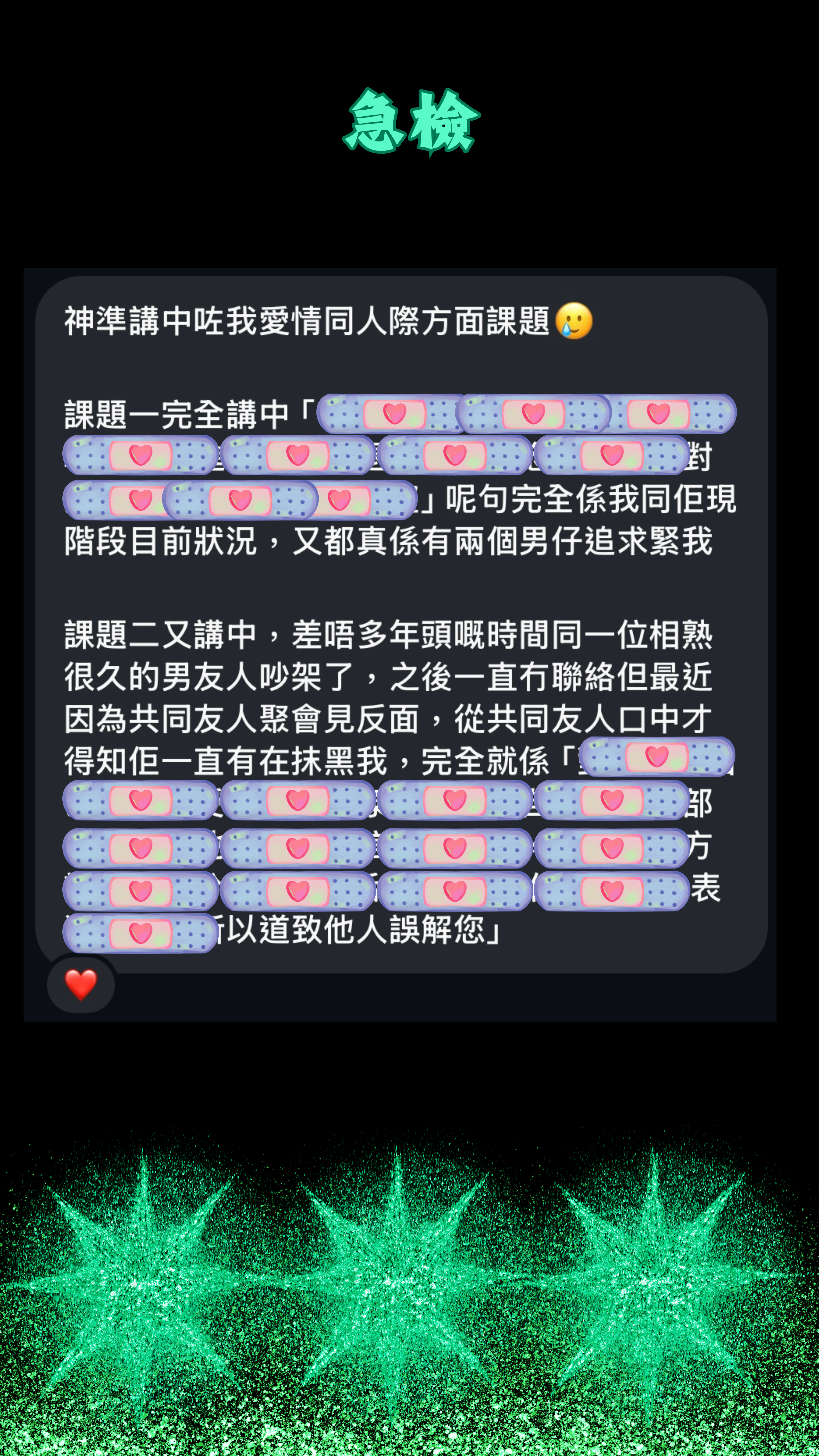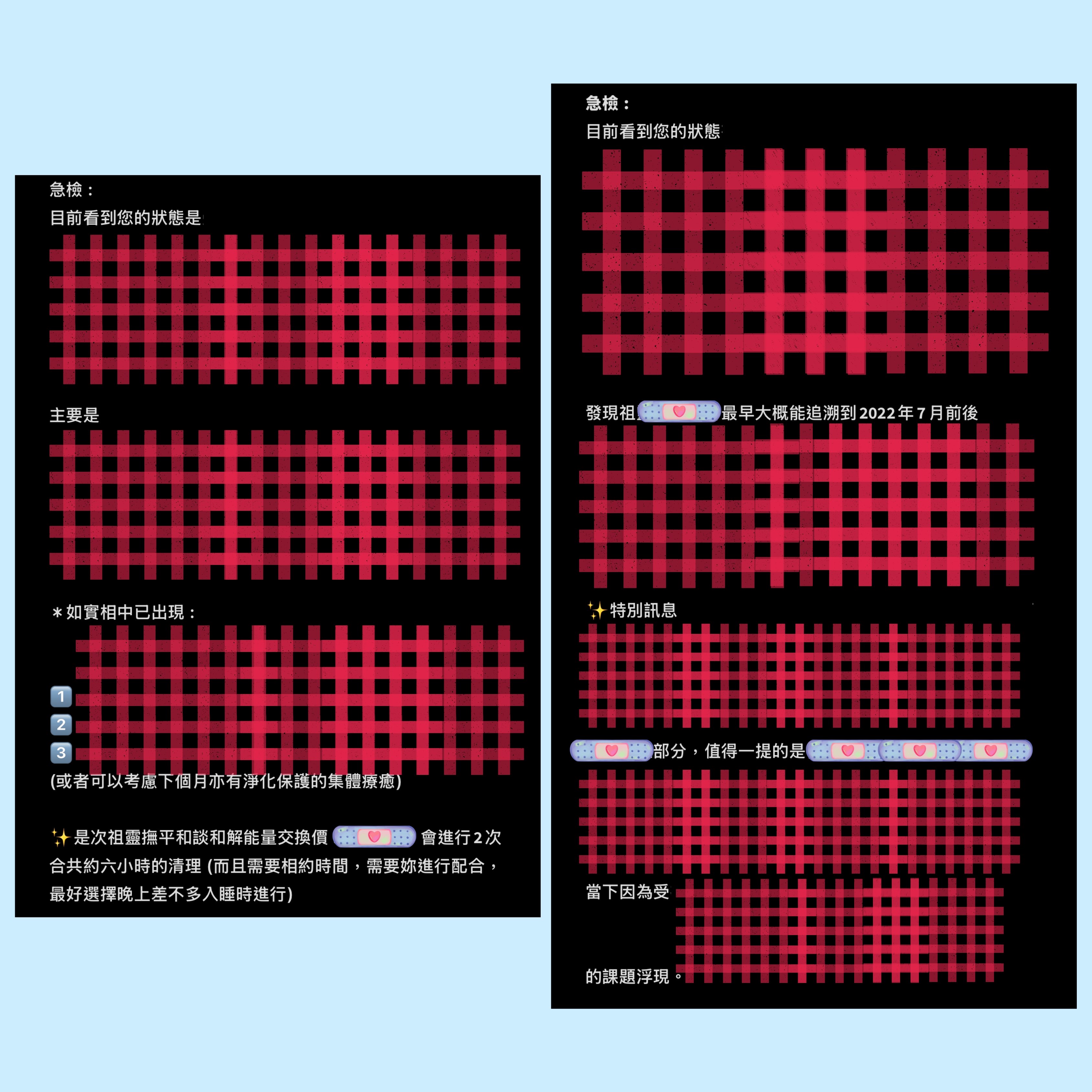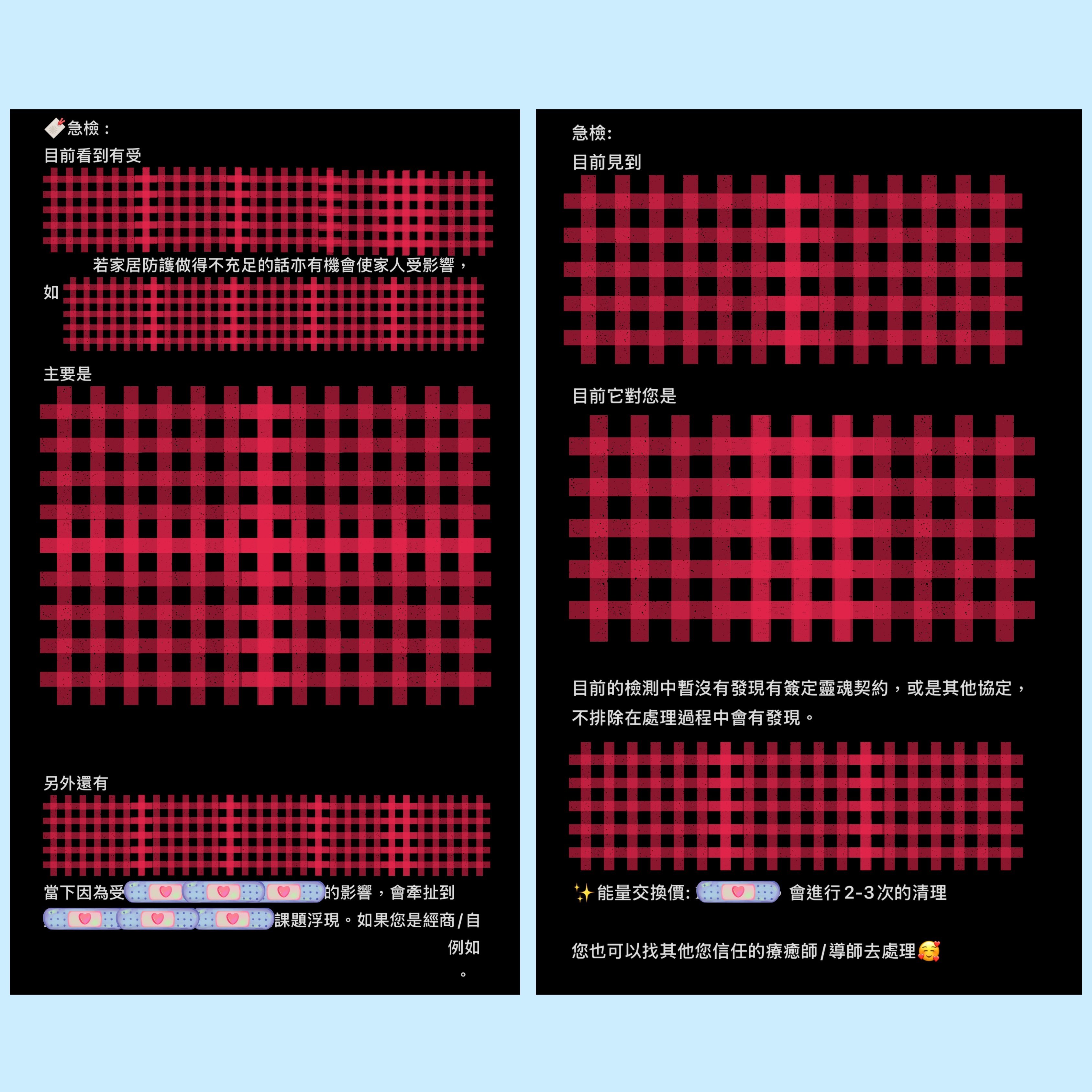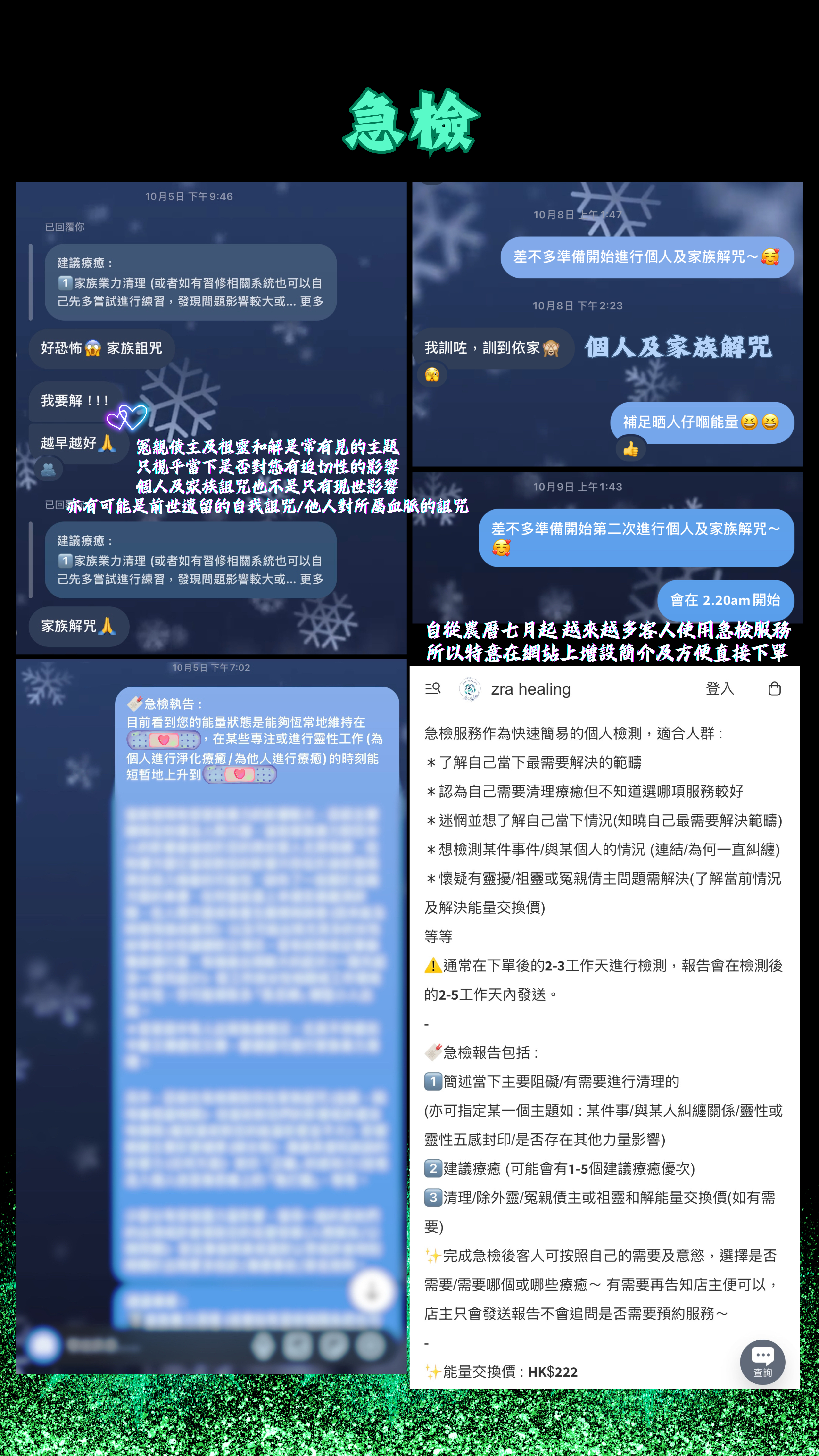 🌊請查閱每月可預約時間,與店主確認時間。 🔺請在備註填寫 中文/英文全名 + 生日年月日 (e.g Chan Da Ming, 01-01-2000) 🔸請在備註填寫聯絡店主時所用的 軟件+電話/名稱 (e.g 𝒔𝒊𝒈𝒏𝒂𝒍 9731 4644 / 𝑰𝑮 𝒛𝒓𝒂._.𝒉𝒆𝒂𝒍𝒊𝒏𝒈 等) 🔹收件地址可填寫 -- / NV - 急檢服務作為快速簡易的個人檢測,適合人群 : *了解自己當下最需要解決的範疇 *認為自己需要清理療癒但不知道選哪項服務較好 *迷惘並想了解自己當下情況(知曉自己最需要解決範疇) *想檢測某件事件/與某個人的情況 (連結/為何一直糾纏) *懷疑有靈擾/祖靈或冤親倩主問題需解決(了解當前情況及解決能量交換價) 等等 ⚠️通常在下單後的𝟮-𝟯工作天進行檢測,報告會在檢測後的𝟮-𝟱工作天內發送。 - 🔖急檢報告包括 : 1️⃣簡述當下主要阻礙/有需要進行清理的 (亦可指定某一個主題如 : 某件事/與某人糾纏關係/靈性或靈性五感封印/是否存在其他力量影響) 2️⃣建議療癒 (可能會有𝟭-𝟱個建議療癒優次) 3️⃣清理/除外靈/冤親債主或祖靈和解能量交換價(如有需要) ✨完成急檢後客人可按照自己的需要及意慾,選擇是否需要/需要哪個或哪些療癒~ 有需要再告知店主便可以,店主只會發送報告不會追問是否需要預約服務~ - ✨能量交換價 : 𝗛𝗞$𝟮𝟮𝟮 - 檢測需提供資料 : 1️⃣ 英文/中文法定全名 (如果是併音請提供中文全名) 2️⃣ 生日年月日 - 🔺所有服務、課程均需付費預約。 🔺此服務會以個案當下最高利益去進行。 🔺若個案當下不適合進行這個清理及療癒會告知,並不會接這個𝑪𝒂𝒔𝒆。